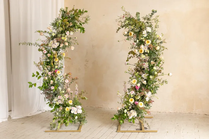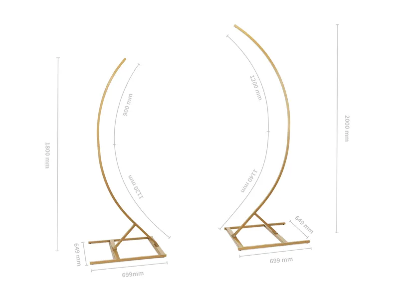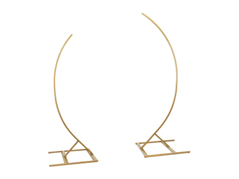 Stojak w kształcie dwóch łuków, wykonany ze stali w kolorze złotym, wysokość łuków 200 cm i 180 cm. Produkt łatwy w montażu, po złożeniu stanowi stabilną konstrukcję. Nadaje się do wielokrotnego użycia, idealny do profesjonalnego zastosowania. Zestaw zawiera dwa stojaki, każdy stojak składa się z 3 elementów. Liczba elementów w kartonie: 6 części stojaka, 12 śrub do montażu, 2 klucze imbusowe oraz instrukcja. Wymiary kartonu: 14x112x6,9 cm. Dokładne wymiary stojaka podane zostały na grafice pod zdjęciem produktu.