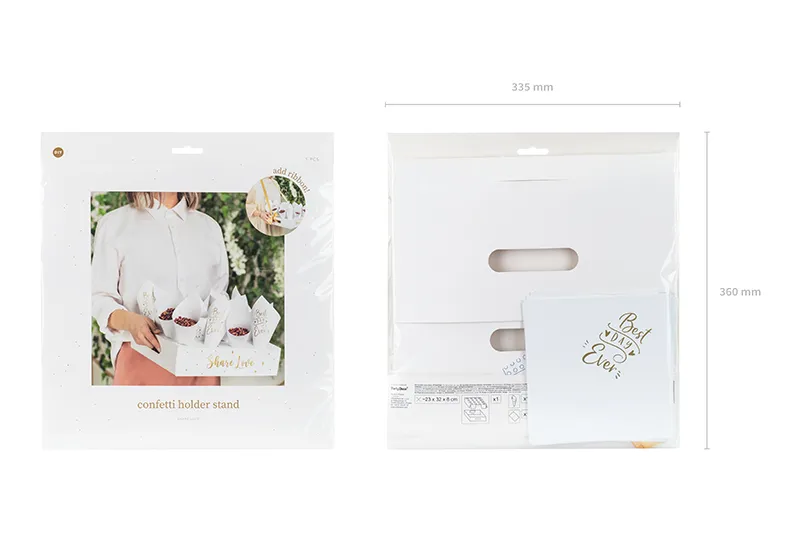 Stojak na rożki do konfetti, mix kolorów. Zestaw zawiera 16 papierowych rożków na konfetti ze złotym napisem oraz stand do samodzielnego złożenia.