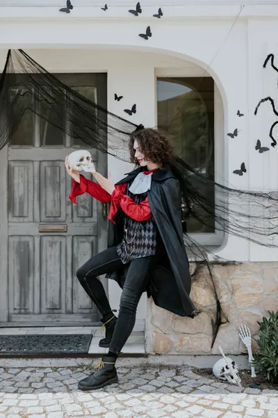 Strój Dracula, mix kolorów, rozmiar L-XL. Zestaw zawiera koszulę, pelerynę i czapkę. Skład: poliester – 92%, stal – 3%, PP – 2%, filc – 3%. Sposób konserwacji: prać ręcznie.