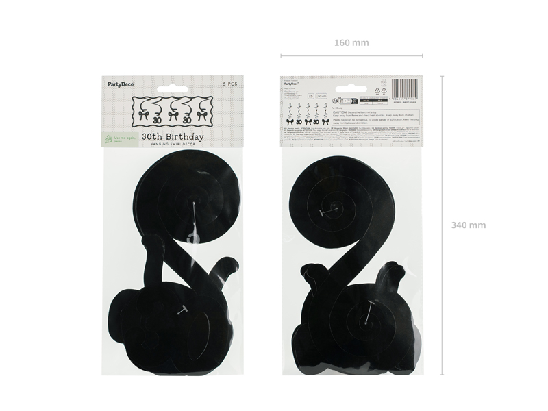 Czarne świderki urodzinowe. Zestaw zawiera 5 sztuk (2 x liczba 30, 3 x kokardka). Długość po rozwieszeniu około 50 cm. Świderki zakończone bezbarwnym haczykiem ułatwiającym mocowanie. (1 op. / 5 szt.)