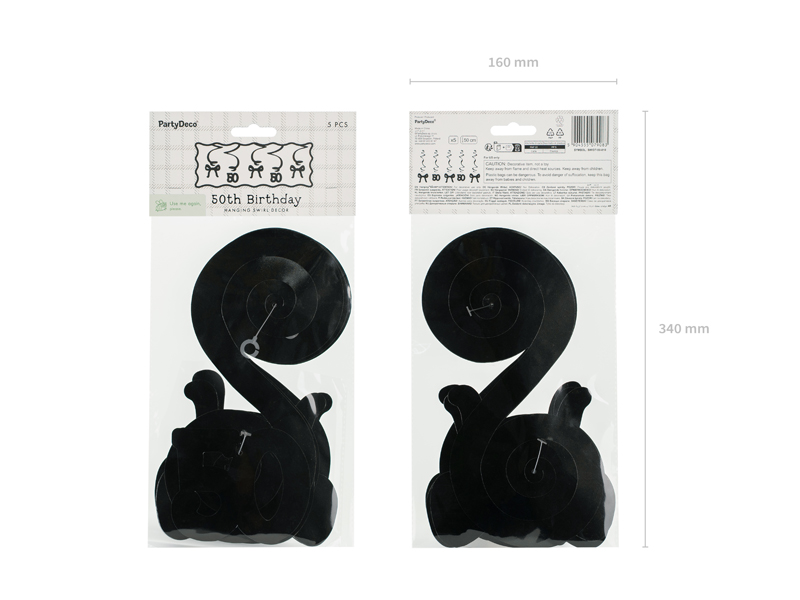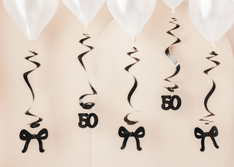 Czarne świderki urodzinowe. Zestaw zawiera 5 sztuk (2 x liczba 50, 3 x kokardka). Długość po rozwieszeniu około 50 cm. Świderki zakończone bezbarwnym haczykiem ułatwiającym mocowanie. (1 op. / 5 szt.)