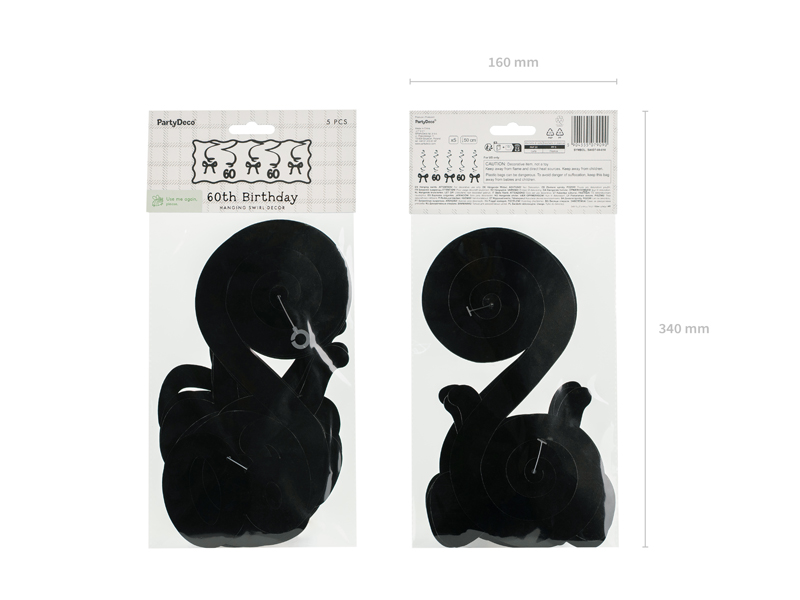Czarne świderki urodzinowe. Zestaw zawiera 5 sztuk (2 x liczba 60, 3 x kokardka). Długość po rozwieszeniu około 50 cm. Świderki zakończone bezbarwnym haczykiem ułatwiającym mocowanie. (1 op. / 5 szt.)