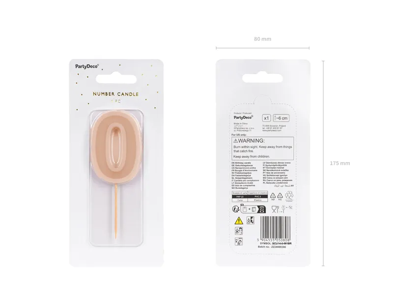 Świeczka urodzinowa Cyfra 0 w kolorze brudnego różu, Wysokość świeczki ok. 6 cm, wysokość świeczki z patyczkiem ok. 10 cm. Świeczka posiada drewniany patyczek.