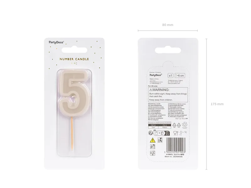 Świeczka urodzinowa Cyfra 5 w kolorze beżowym, Wysokość świeczki ok. 6 cm, wysokość świeczki z patyczkiem ok. 10 cm. Świeczka posiada drewniany patyczek.