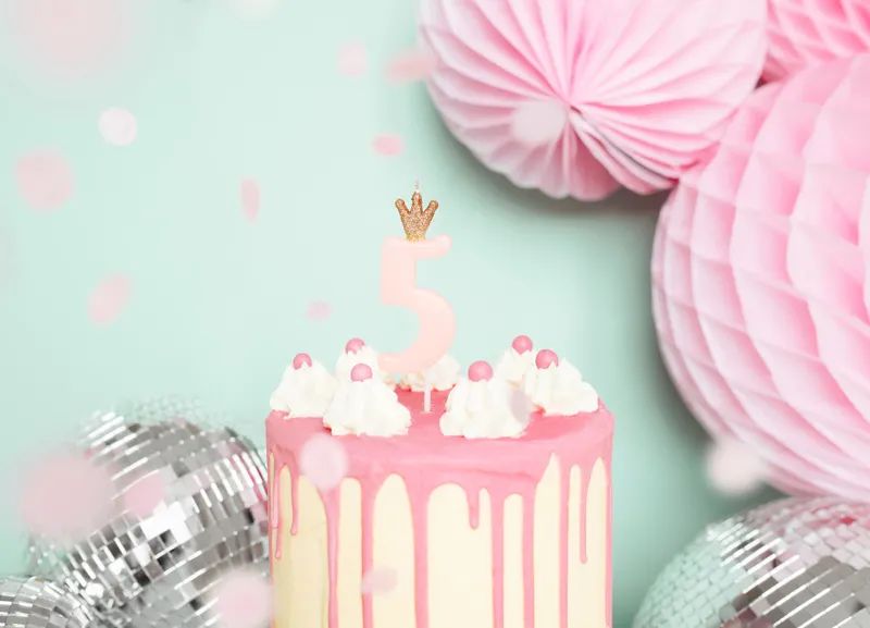 Świeczka urodzinowa Cyferka 5 w kolorze jasnoróżowym, rozmiar ok. 9.5 cm.