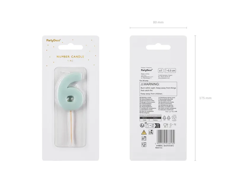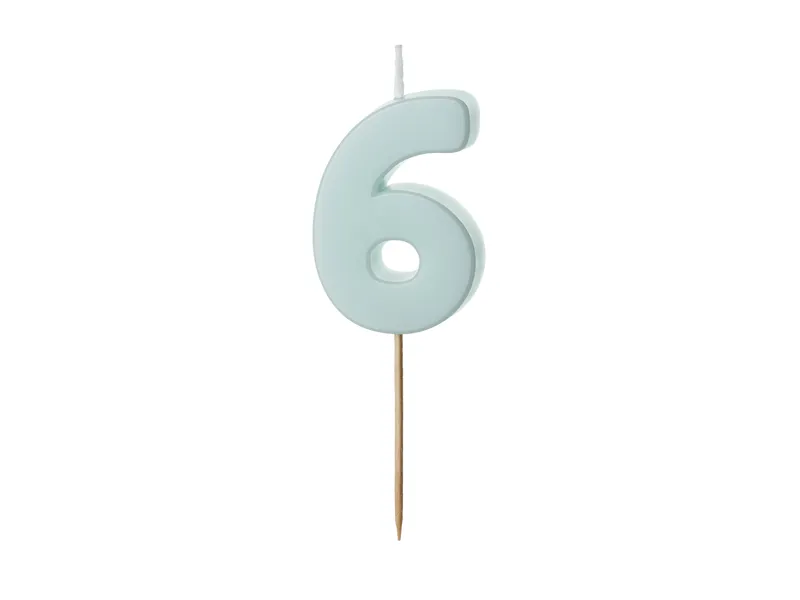 Świeczka urodzinowa Cyferka 6, w kolorze jasnoniebieskim, rozmiar ok. 5.5 cm.