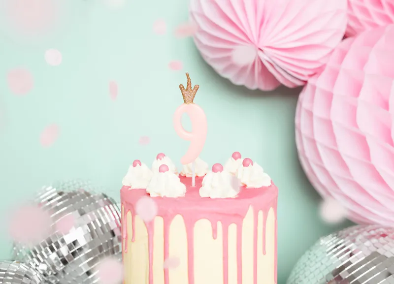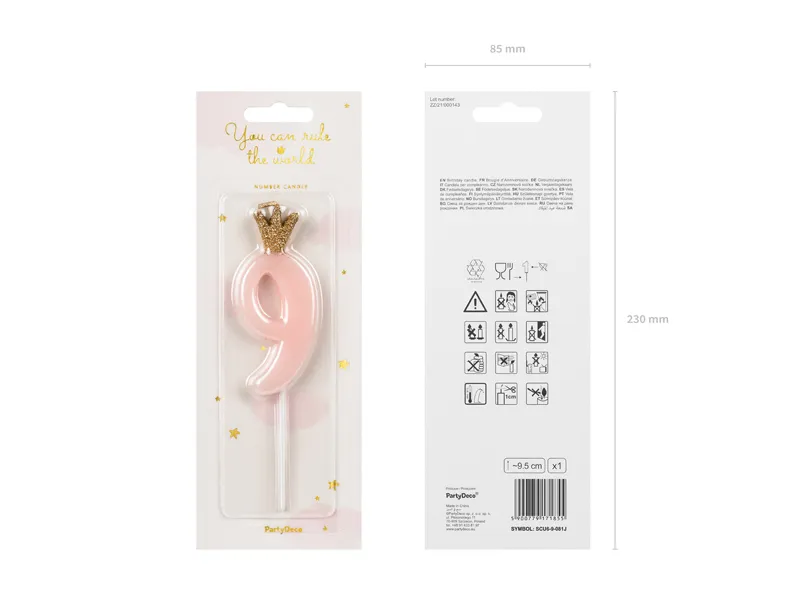 Świeczka urodzinowa Cyferka 9 w kolorze jasnoróżowym, rozmiar ok. 9.5 cm.