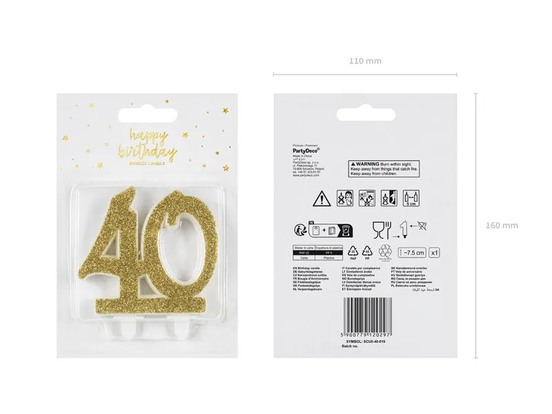 Świeczka urodzinowa liczba 40 w kolorze złotym brokatowym, rozmiar ok. 7.5 cm.