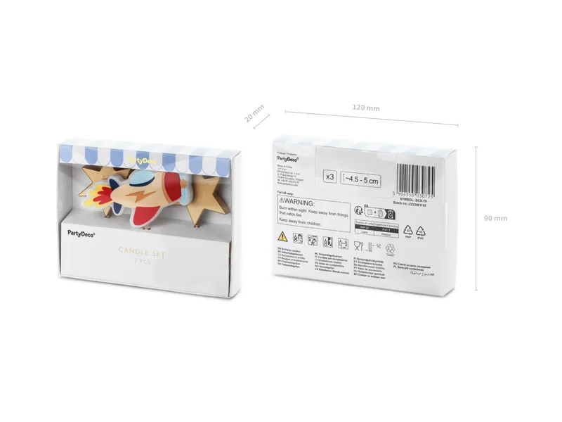 Świeczki urodzinowe Samolot, mix kolorów i wzorów, wysokość ok. 4.5 – 5 cm. (1 op. / 3 szt.)