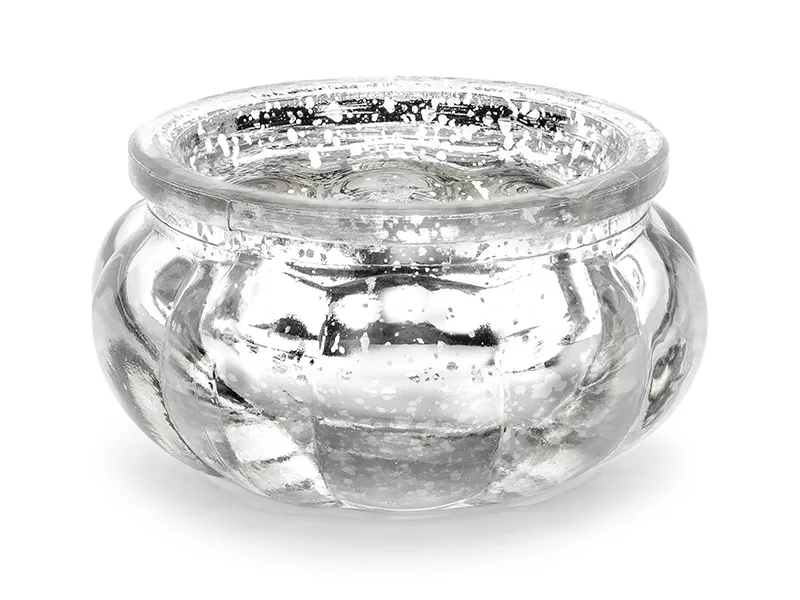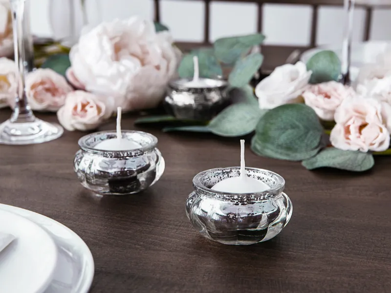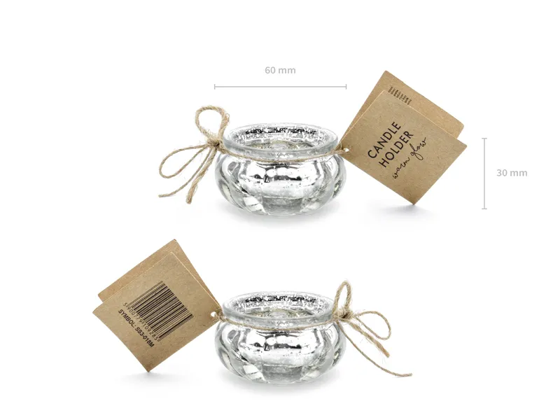 Szklany świecznik w kolorze srebrnym lustrzanym, szerokość ok. 6 cm, wysokość ok. 3 cm. (1 op. / 4 szt.)