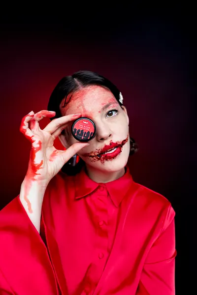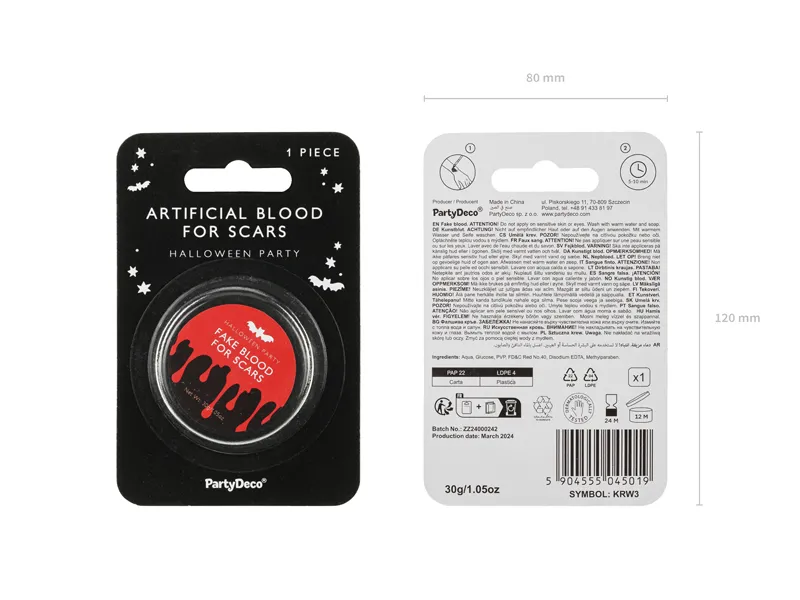 Sztuczna krew do blizn w plastikowym pojemniku o pojemności 30 g. Krew o żelowej konsystencji, idealna do tworzenia imitacji ran. Gęsta, nie spływa po aplikacji. Skład: woda – 53,4%, glukoza – 40,0%, PVP – 5,0%, Disodium EDTA – 0,5%, Methylparaben – 0,1%, FD&C Red No.40 – 1,0% Testowane dermatologicznie. Nie nakładać na wrażliwą skórę lub oczy. Zmyć za pomocą ciepłej wody z mydłem.
