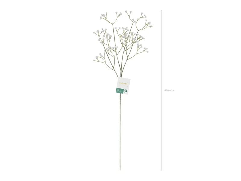 Sztuczny kwiat – Gipsówka w kolorze białym. W opakowaniu znajduje się jedna łodyga, od której odchodzą 3 gałązki z kwiatami. Wysokość około 62 cm. Średnica pojedynczego kwiatka około 1 cm.