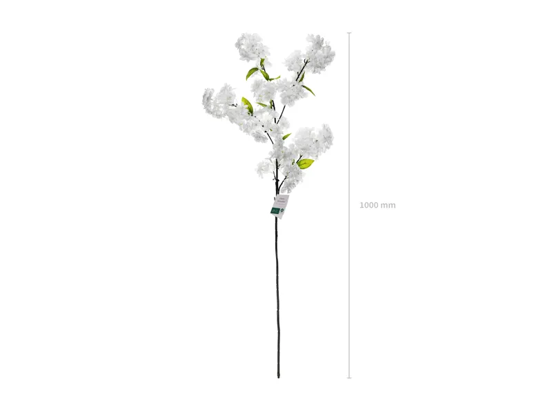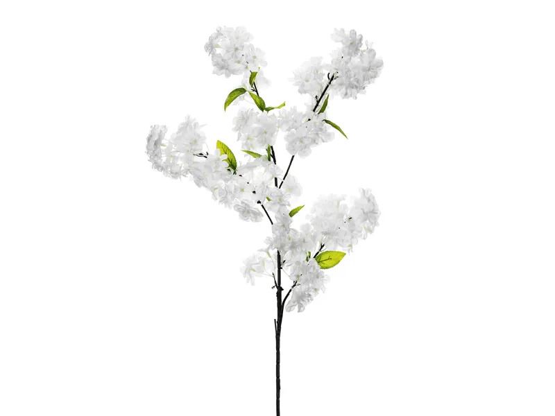 Sztuczny Kwiat – Kwitnąca Wiśnia w kolorze białym z zielonymi listkami. Wysokość ok 97 cm. W opakowaniu znajduje się jedna łodyga, od której odchodzą 4 gałązki z kwiatami. Średnica pojedynczego kwiatka około 4-5,5 cm.