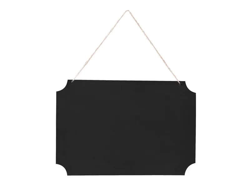 Tabliczka wisząca do napisów w kolorze czarnym, do samodzielnego wypisania, wykonana z grubego papieru, z jutowym sznurkiem. Zestaw zawiera dwie kredy: białą i czerwoną. Wymiary 45×30 centymetrów.