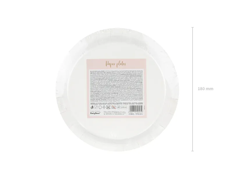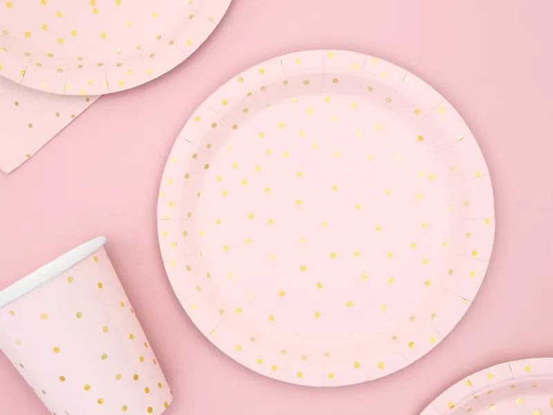 Talerzyki papierowe w kolorze jasnoróżowym ze złotym wzorem kropek, średnica ok. 18 cm. (1 op. / 6 szt.)