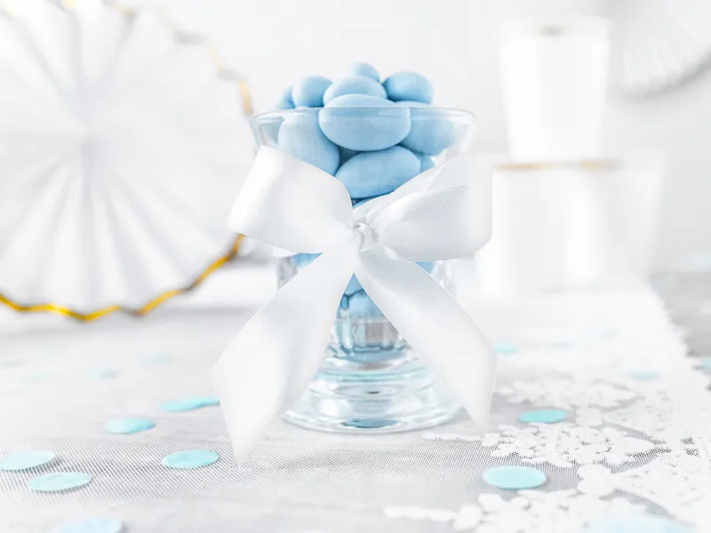 Tasiemka satynowa w kolorze białym, szerokość 25 milimetrów, długość 25 metrów. (1 szt. / 25 mb.)