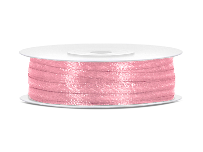 Tasiemka satynowa w kolorze jasnoróżowym, szerokość 3 milimetry, długość 50 metrów.