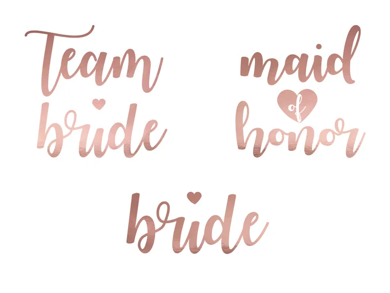 Tatuaże zmywalne na wieczór panieński w kolorze różowego złota, zestaw zawiera napisy: bride (2 szt.), maid of honor (2 szt.) i team bride (9 szt.). (1 op. / 13 szt.)