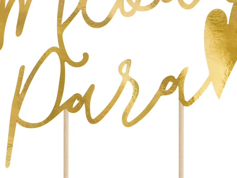 Topper na tort Młoda Para, wykonany z papieru lustrzanego w kolorze złotym, wysokość ok. 22,5 cm.