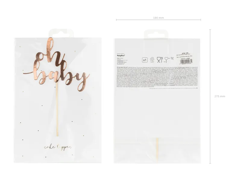Topper na tort napis Oh baby w kolorze różowego złota, wysokość ok 25 cm.