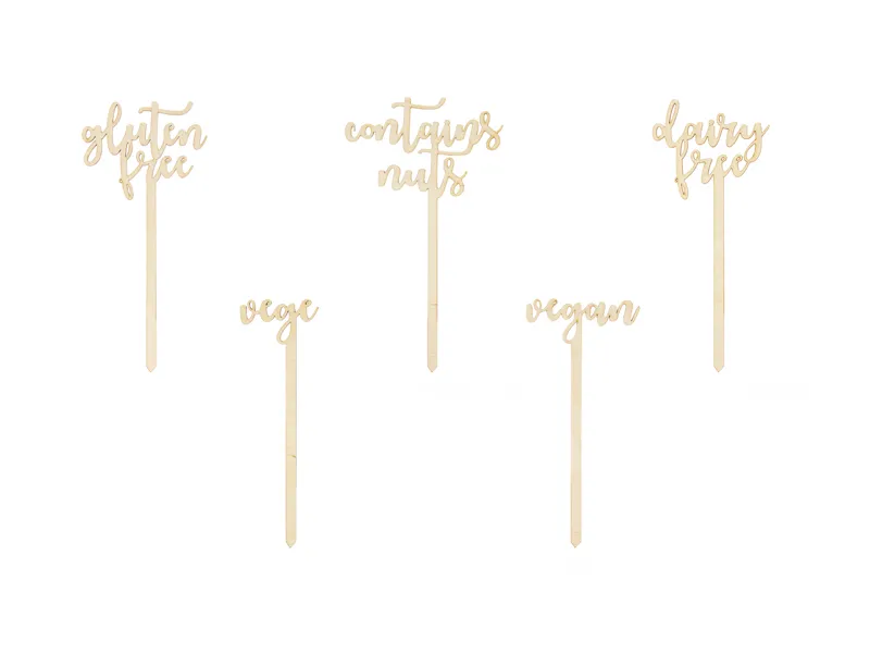Drewniane toppery na słodki stół, zestaw zawiera 5 topperów z napiami: Vege, Vegan, Dairy free, Contains nuts i Gluten free, wysokość ok. 14.5-16 cm.