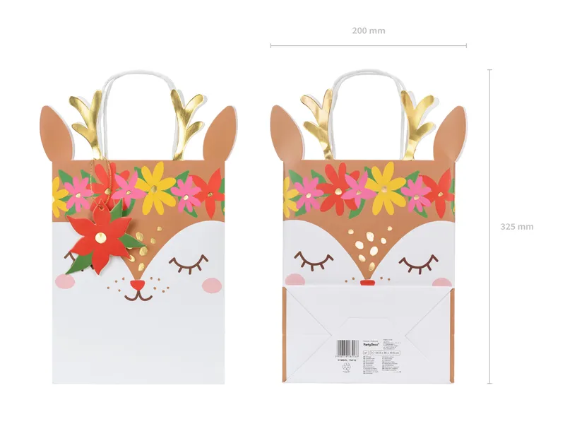 Torebka na prezenty Jelonek w kolorze białym z kolorowym i złotym metalizowanym nadrukiem, wymiary bez uchwytów ok. 20.5 x 30 x 10.5 cm.