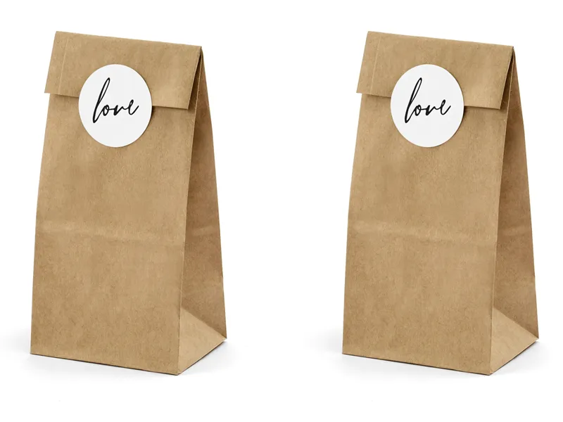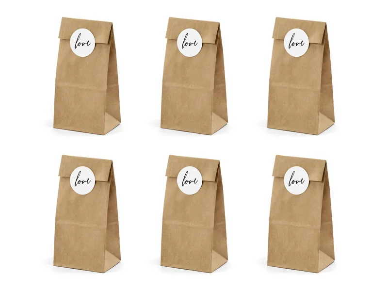 Torebki na słodycze wykonane z papieru kraft, z 6 białymi naklejkami z napisem Love wymiary po złożeniu ok. 8x18x6 cm. (1 op. / 6 szt.)