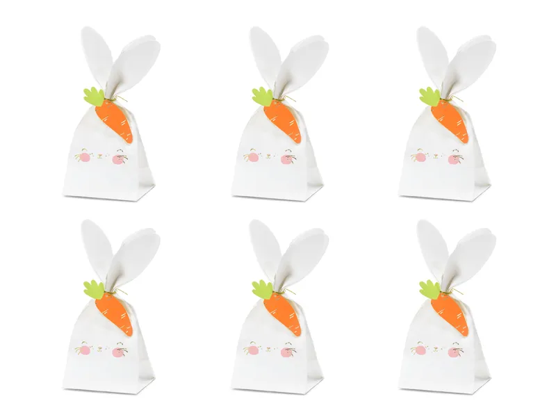 Torebki na słodycze Króliki, wykonane z papieru, zestaw zawiera: 6 torebek w kolorze białym, 6 zawieszek w kształcie marchewki, 3 nitki w kolorze złotym, wymiary ok. 7.5 x 9 x 22.5 cm. (1 op. / 6 szt.)