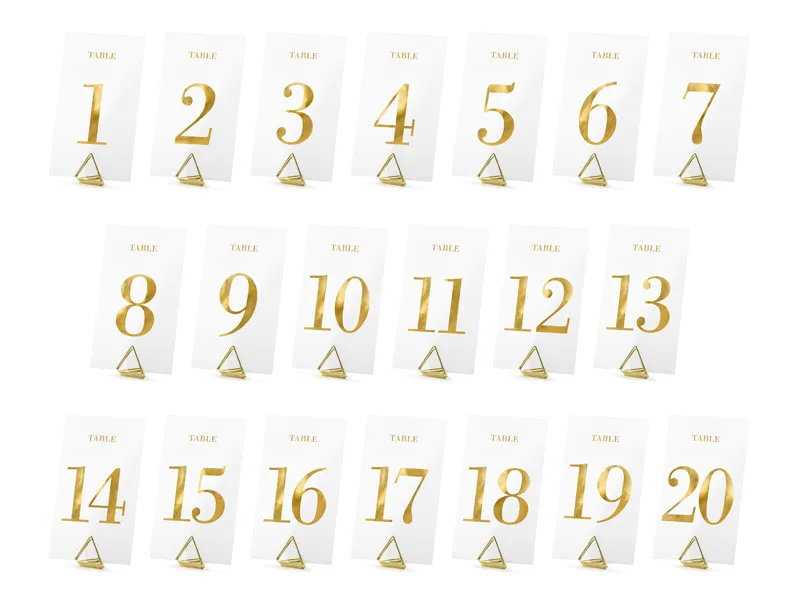 Numery na stół wykoane z transparentnej folii z złotym metalizowanym nadrukiem cyfr, zestaw zawiera numer od 1 do 20, rozmiar ok. 7 x 12 cm. (1 op. / 20 szt.)