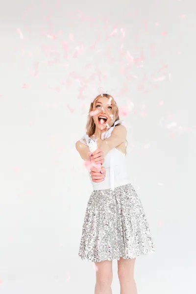 Tuba strzelająca bibułowymi penisami w kolorze jasnoróżowym, długość 20 centymetrów.