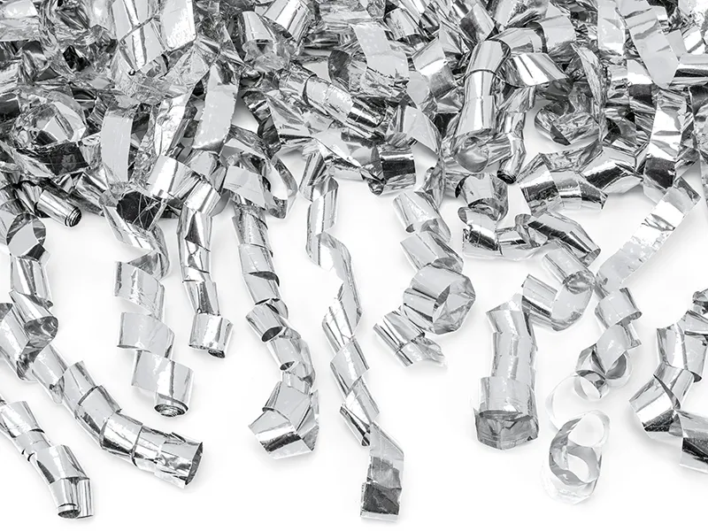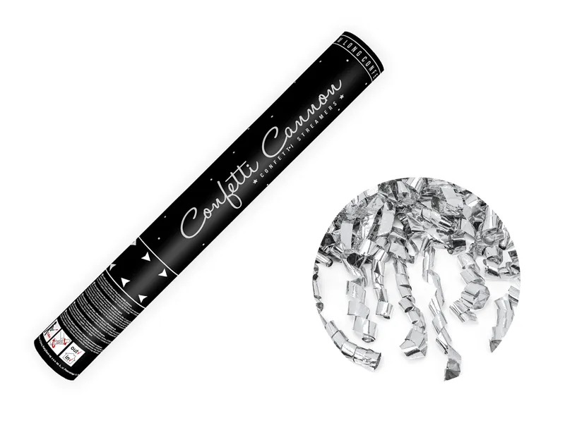 Tuba strzelająca długimi metalicznymi serpentynami w kolorze srebrnym, długość 40 cm.