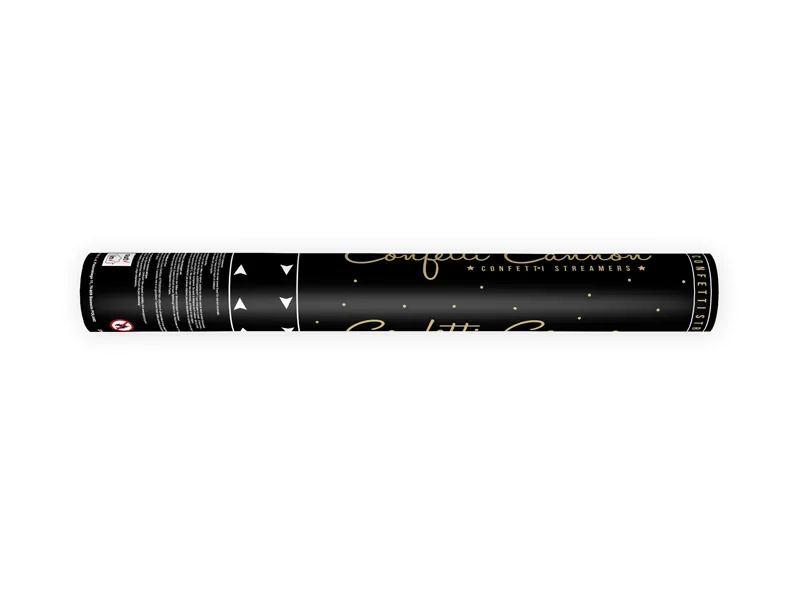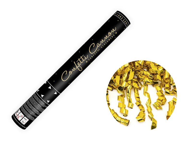 Tuba strzelająca długimi metalicznymi serpentynami w kolorze złotym, długość 40 cm.