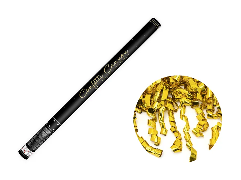 Tuba strzelająca długimi metalicznymi serpentynami w kolorze złotym, długość 80 cm.