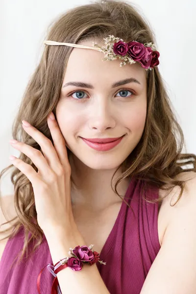 Wianek z kwiatami w kolorze bordowym. Rozmiar wianka jest regulowany.