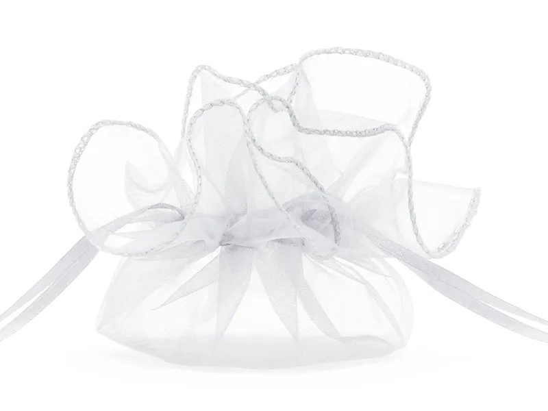 Ściągane woreczki z gładkiej organzy w kolorze białym, średnica ok. 25 cm. Idealne dla gości weselnych. (1 op. / 10 szt.)