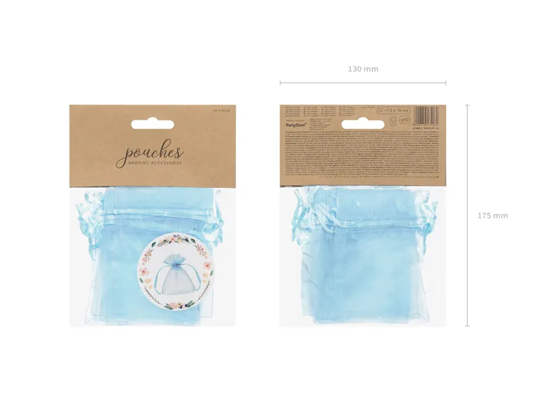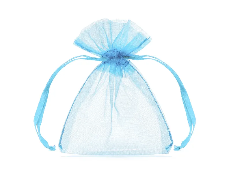 Ściągane woreczki z gładkiej organzy w kolorze błękitnym, wymiary ok. 7.5 x 10 cm. Idealne dla gości weselnych. (1 op. / 10 szt.)