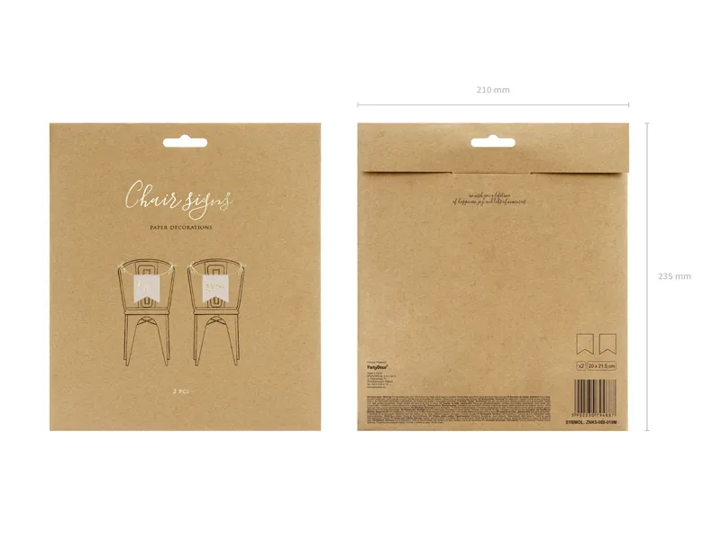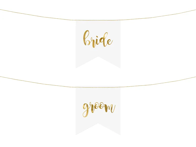 Zawieszki na krzesła wykonane z białego papieru ze złotym metalizowanym napisem Bride i Groom, wymiary ok. 20 x 21,5 cm. (1 op. / 2 szt.)
