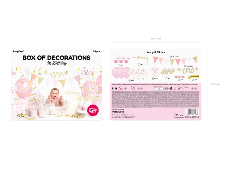 Zestaw dekoracji party – 1st Birthday w kolorze złotym, zestaw zawiera: baner One (1 szt.), girlandę papierową (1 szt.), dekoracje do muffinek (6 szt.), jasnoróżowe papilotki na muffinki (6 szt.), topper na tort (1 szt.), słomki (10 szt.), balony (mix wzorów, 6 szt.), złote serpentyny (1 szt.) i jasnoróżową tasiemkę satynową (szerokość 6 mm, 1 szt.).