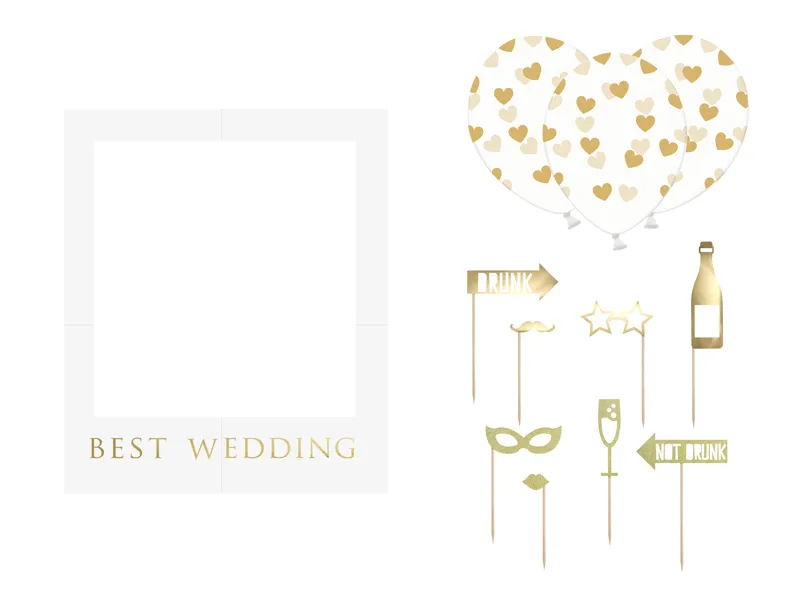 Zestaw z ramką do selfie, zestaw zawiera: białą ramkę ze złotym napisem Best Wedding (wymiary po złożeniu ok. 50 x 59,5 cm, 1 szt.), gadżety do zdjęć w kolorze złotym (wysokość po złożeniu ok. 21 – 42 cm, 8 szt.), transparentne balony w złote serca (rozmiar ok. 30 cm, 3 szt.) i ok. 3 m złotego sznurka.